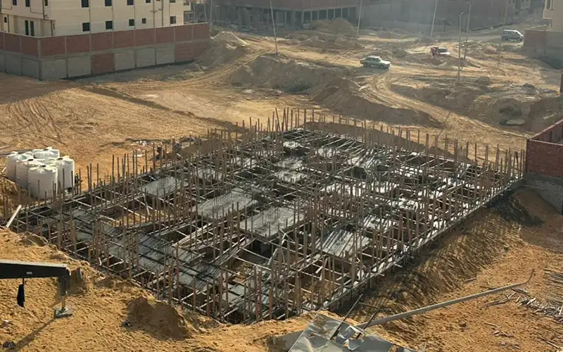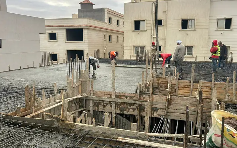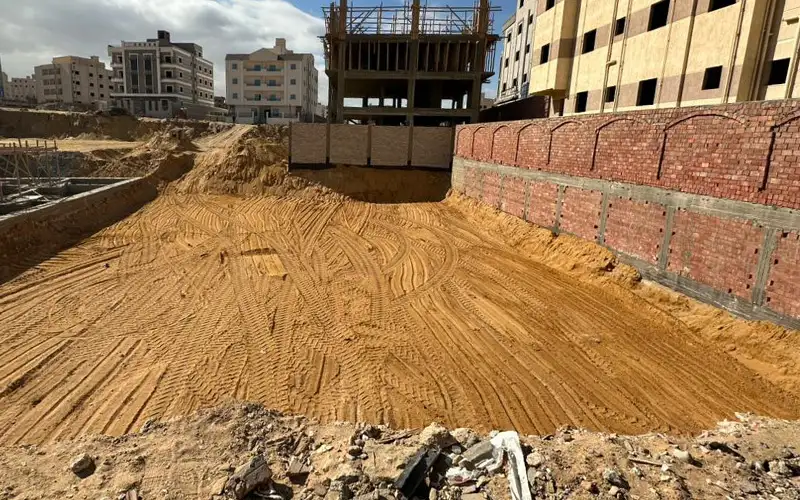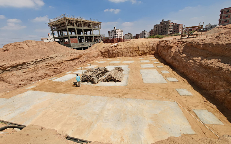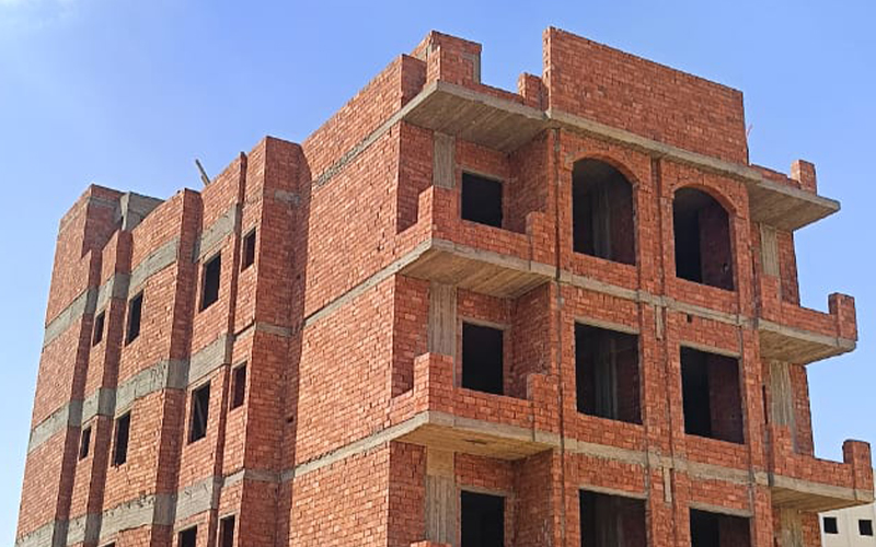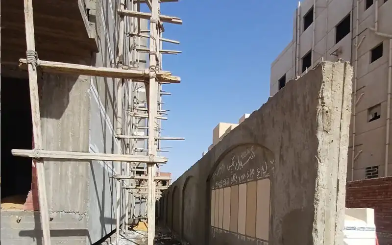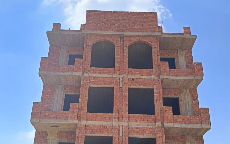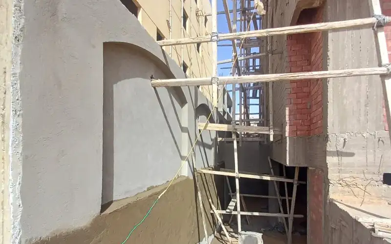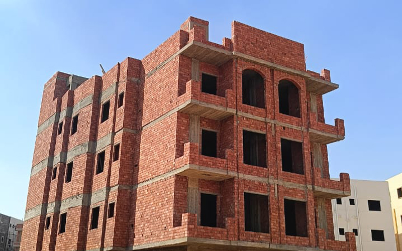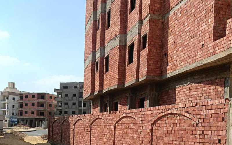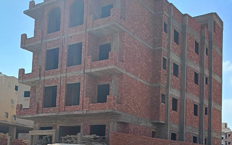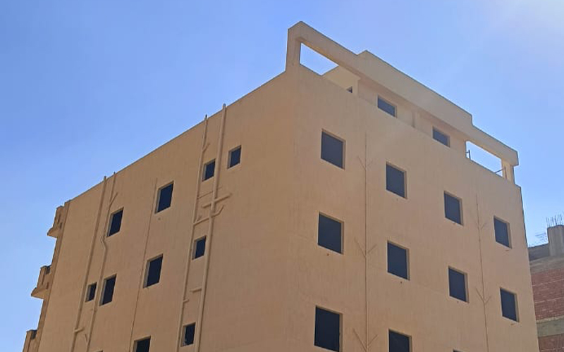 تم الانتهاء من اعمال البياض الداخلي للدور الأرضي والأول والثاني والثالث والسطح والانتهاء من تأسيس كهرباء صواعد السلم والانتهاء من بياض السلم والانتهاء من بياض المناور والبدء في الواجهة الجانبية اليمن وتركيب حديد كوبستات الواجهة الأمامية والجانبية اليسرى علي الممر