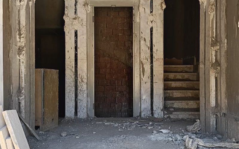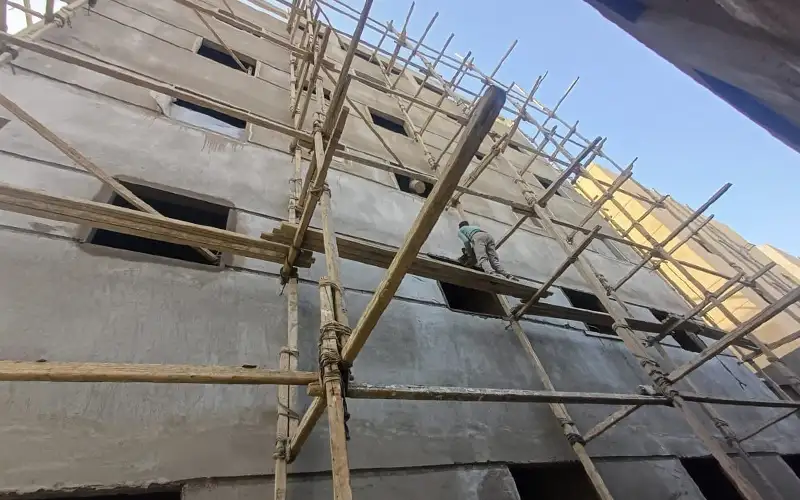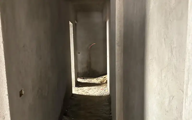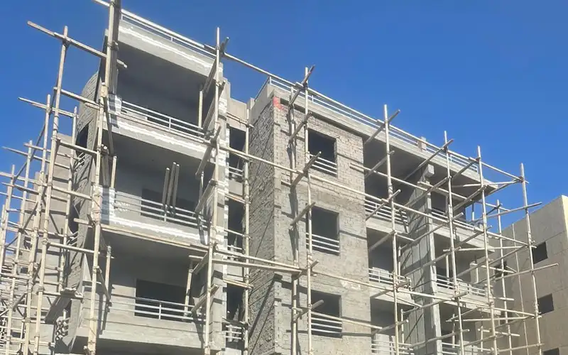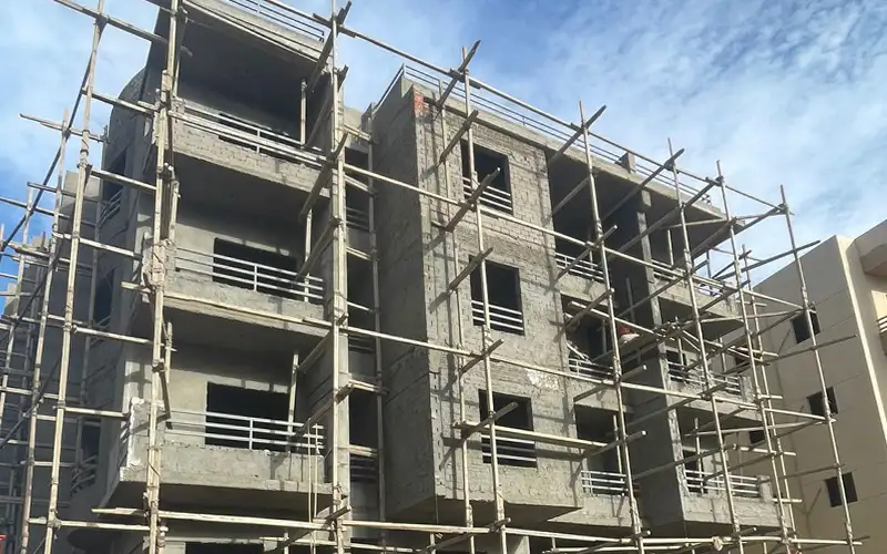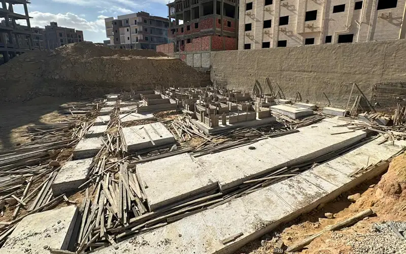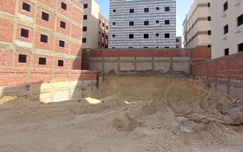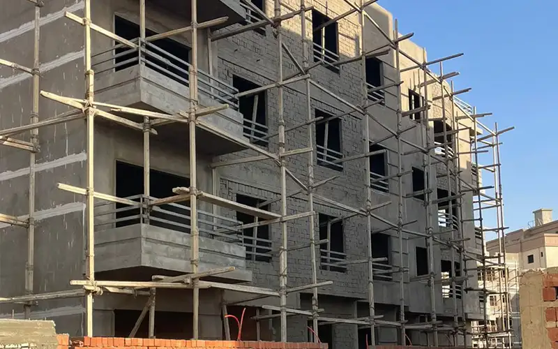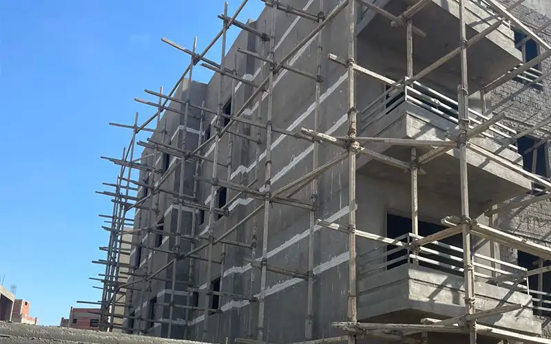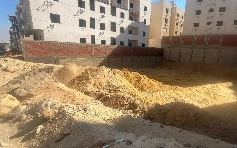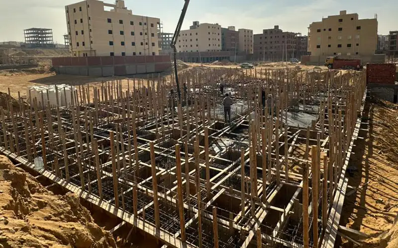 تم الانتهاء من اعمال البياض الداخلي للدور الأرضي والأول والثاني والثالث والسطح والانتهاء من تأسيس كهرباء صواعد السلم والانتهاء من بياض السلم والانتهاء من بياض المناور والبدء في الواجهة الجانبية اليمن وتركيب حديد كوبستات الواجهة الأمامية والجانبية اليسرى علي الممر