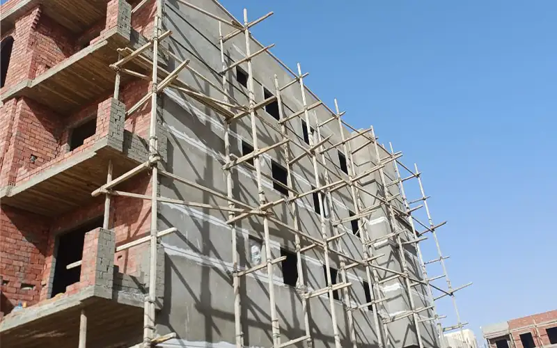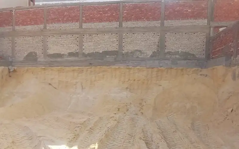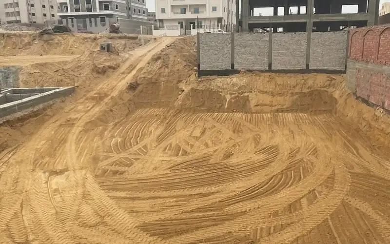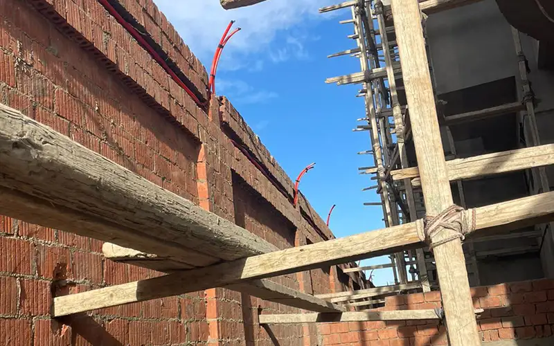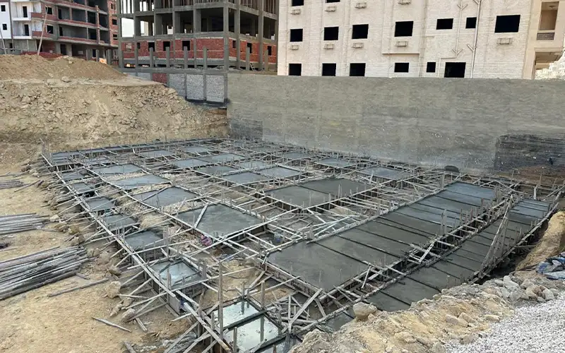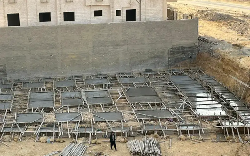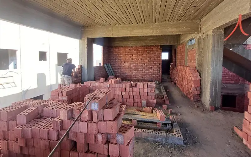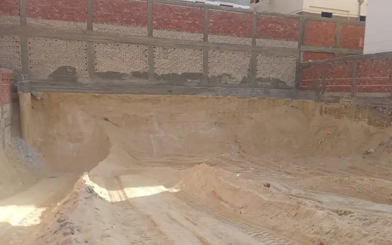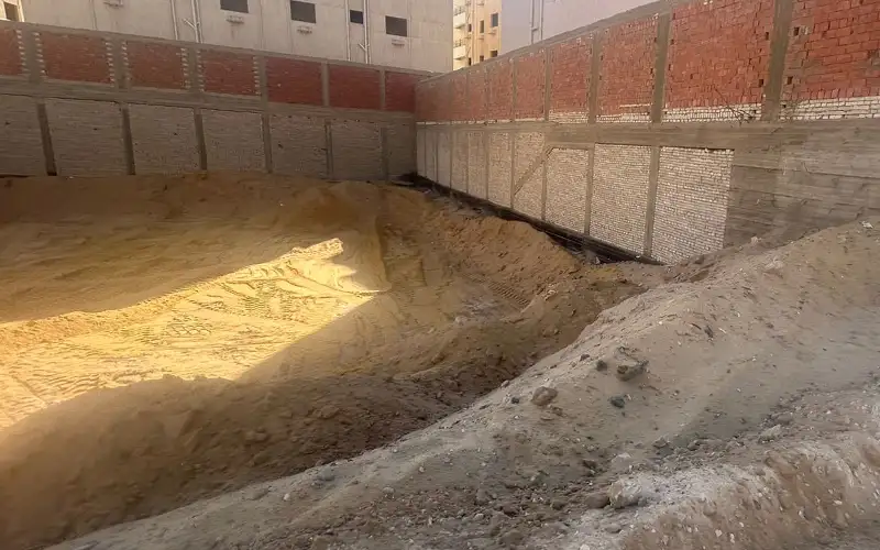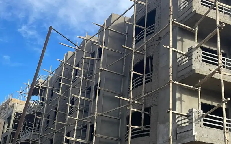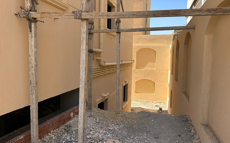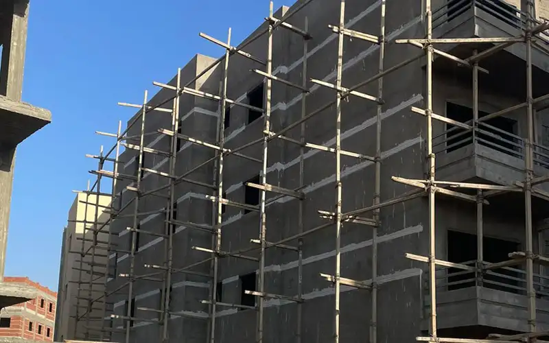 تم الانتهاء من اعمال البياض الداخلي للدور الأرضي والأول والثاني والثالث والسطح والانتهاء من تأسيس كهرباء صواعد السلم والانتهاء من بياض السلم والانتهاء من بياض المناور والبدء في الواجهة الجانبية اليمن وتركيب حديد كوبستات الواجهة الأمامية والجانبية اليسرى علي الممر