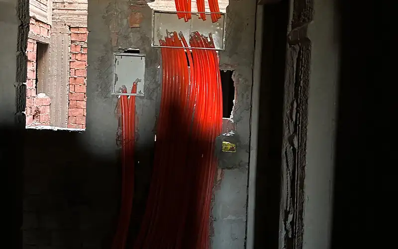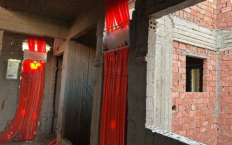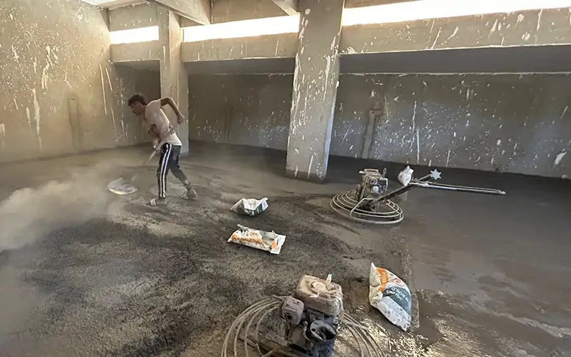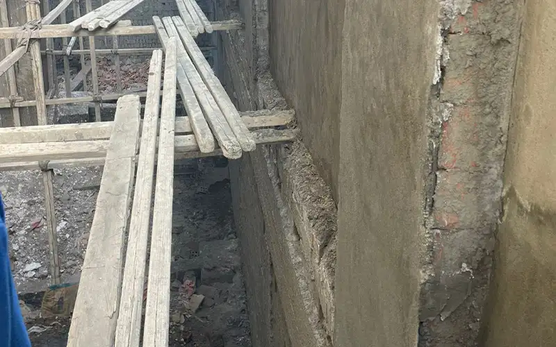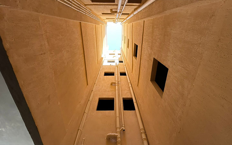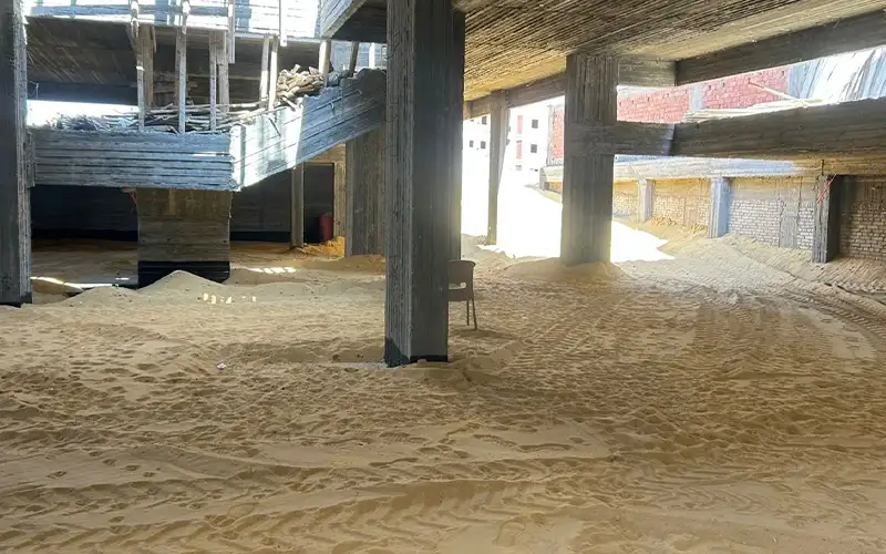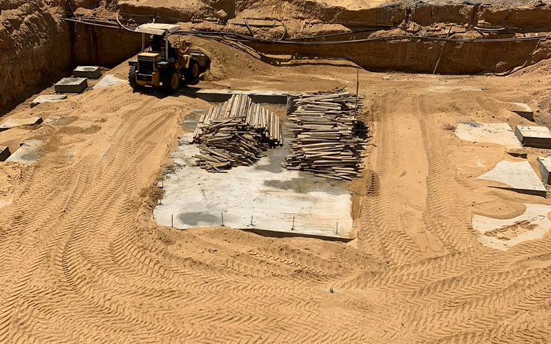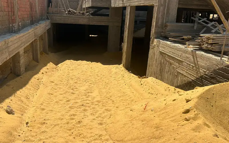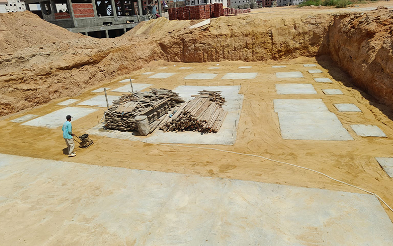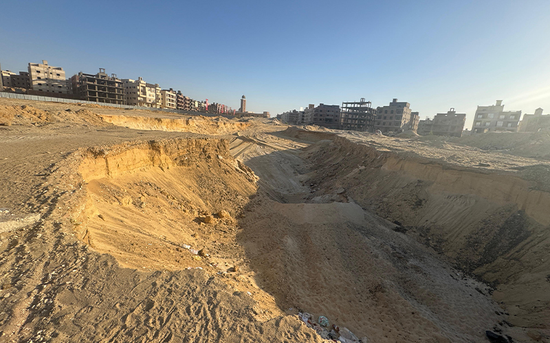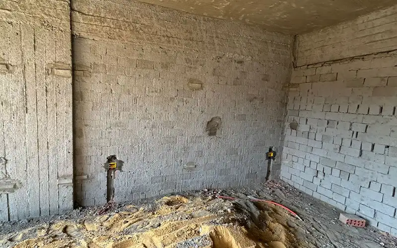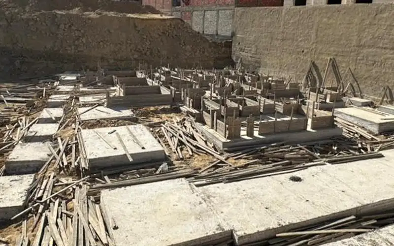 تم الانتهاء من اعمال البياض الداخلي للدور الأرضي والأول والثاني والثالث والسطح والانتهاء من تأسيس كهرباء صواعد السلم والانتهاء من بياض السلم والانتهاء من بياض المناور والبدء في الواجهة الجانبية اليمن وتركيب حديد كوبستات الواجهة الأمامية والجانبية اليسرى علي الممر